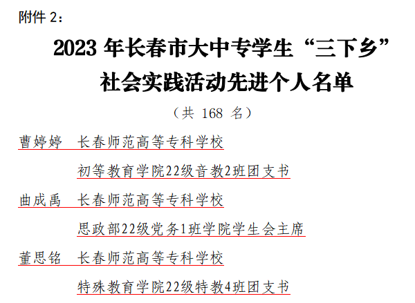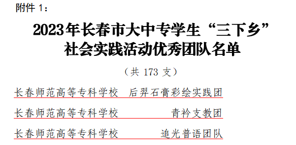 为表彰先进,弘扬典型,近日,2023年长春市大中专学生“三下乡”社会实践活动遴选结果公布。我校共有12个团队及个人获评佳绩,展现出师专青年永远跟党走、奋斗新征程的活力姿态。