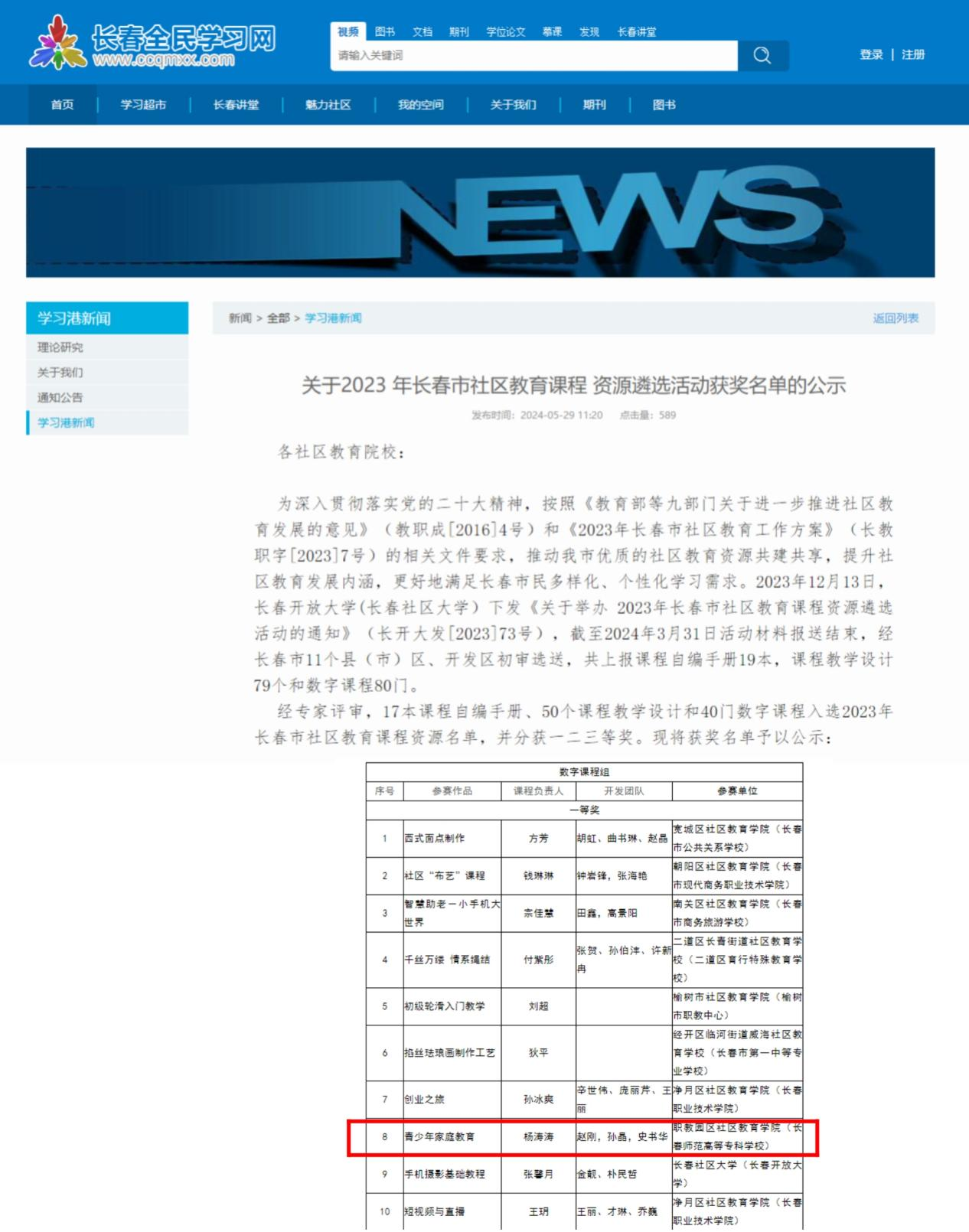 近日,由我校(长春市职教园区社区教育学院)精心录制的《青少年家庭教育》数字课程在参加长春社区大学组织的长春市社区教育课程资源遴选活动的众多优秀作品中脱颖而出,荣获一等奖。