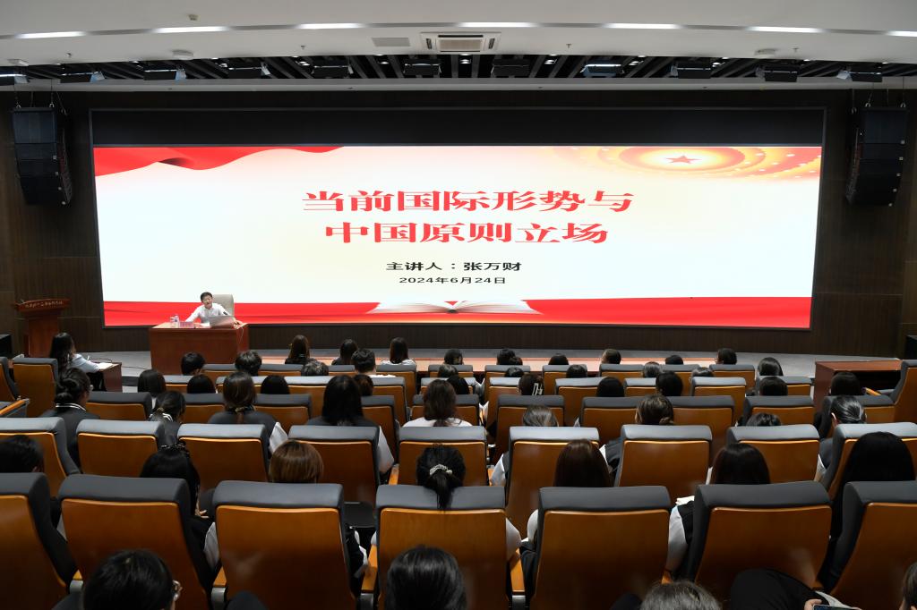 立足国际形势,了解大国担当。2024年6月24日下午,学校党委书记张万财走进“形势与政策”课堂,以“当前国际形势与中国原则立场”为题,为马克思主义学院学生讲授思政课,鼓励同学们主动了解当前国际形势,承担新一代青年人的使命与担当。
