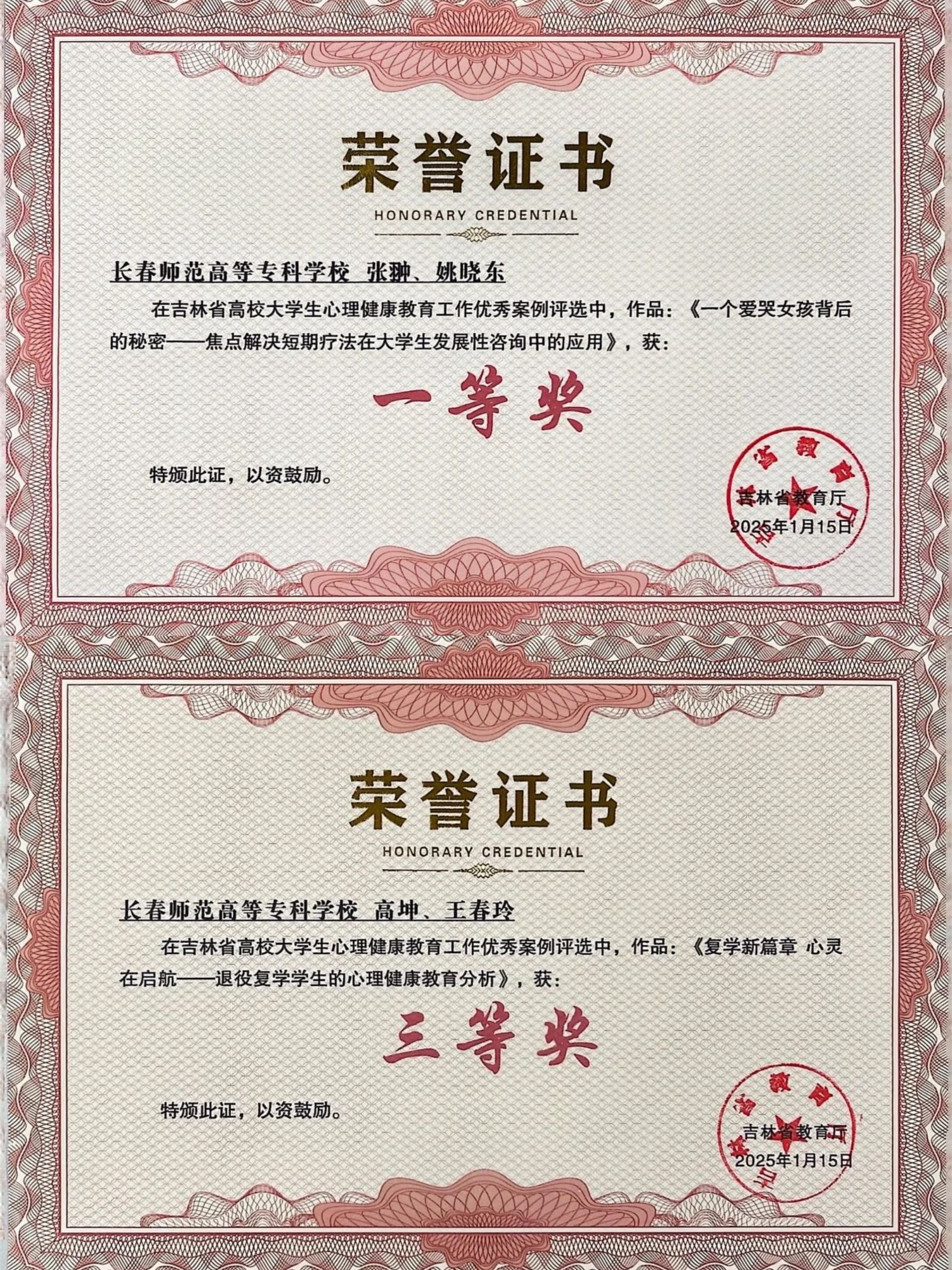 近日,吉林省教育厅公布了吉林省高校大学生心理健康教育工作优秀案例评选结果。在此次评选中,我校姚晓东、张翀老师的案例《一个爱哭女孩背后的秘密——焦点解决短期疗法在大学生发展性咨询中的应用》荣获一等奖,王春玲、高坤老师的案例《复学新篇章 心灵在启航——退役复学学生的心理健康教育分析》荣获三等奖。